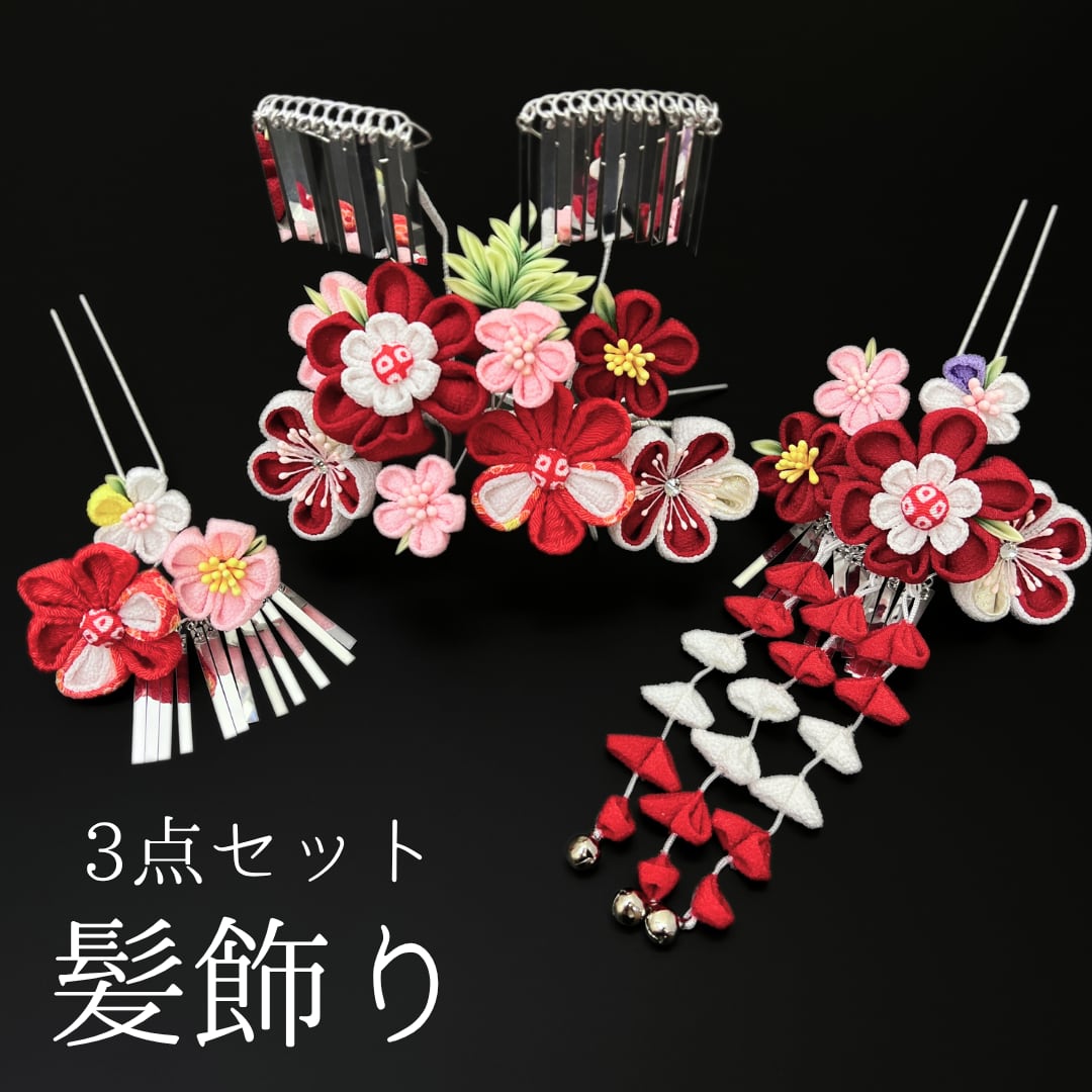 【赤 花 髪飾り 3点セット2】七五三 7歳 七歳 7才 日本髪 新日本髪 和装 着物 赤色 白 花飾り かんざし 簪 髪留め つまみ細工 和柄 ちりめん 縮緬 ビラカン 子供 キッズ HCJA504