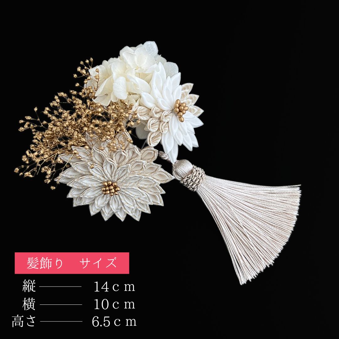 繊細なつまみ細工とブリザーブドフラワーのお花が、晴れ着姿を引き立てます。