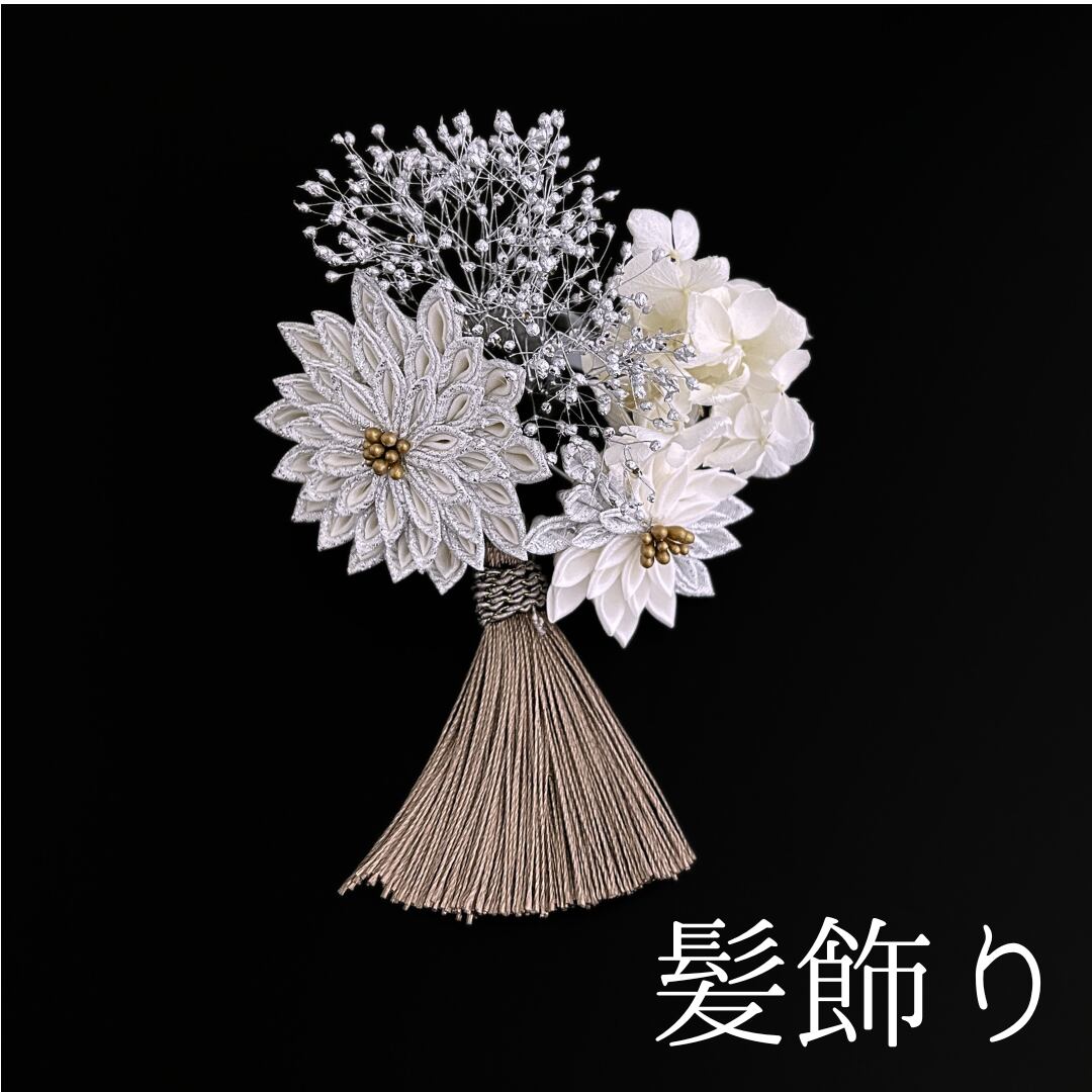 【シルバー 花 髪飾り】七五三 3歳 三歳 5歳 五歳 7歳 七歳 卒園式 卒業式 成人式 振袖 訪問着 和装 着物 袴 浴衣 ゆかた シルバー 白 ブラウン 花飾り パッチンピン パッチン留め 髪留め つまみ細工 タッセル 子供 キッズ HCJA482