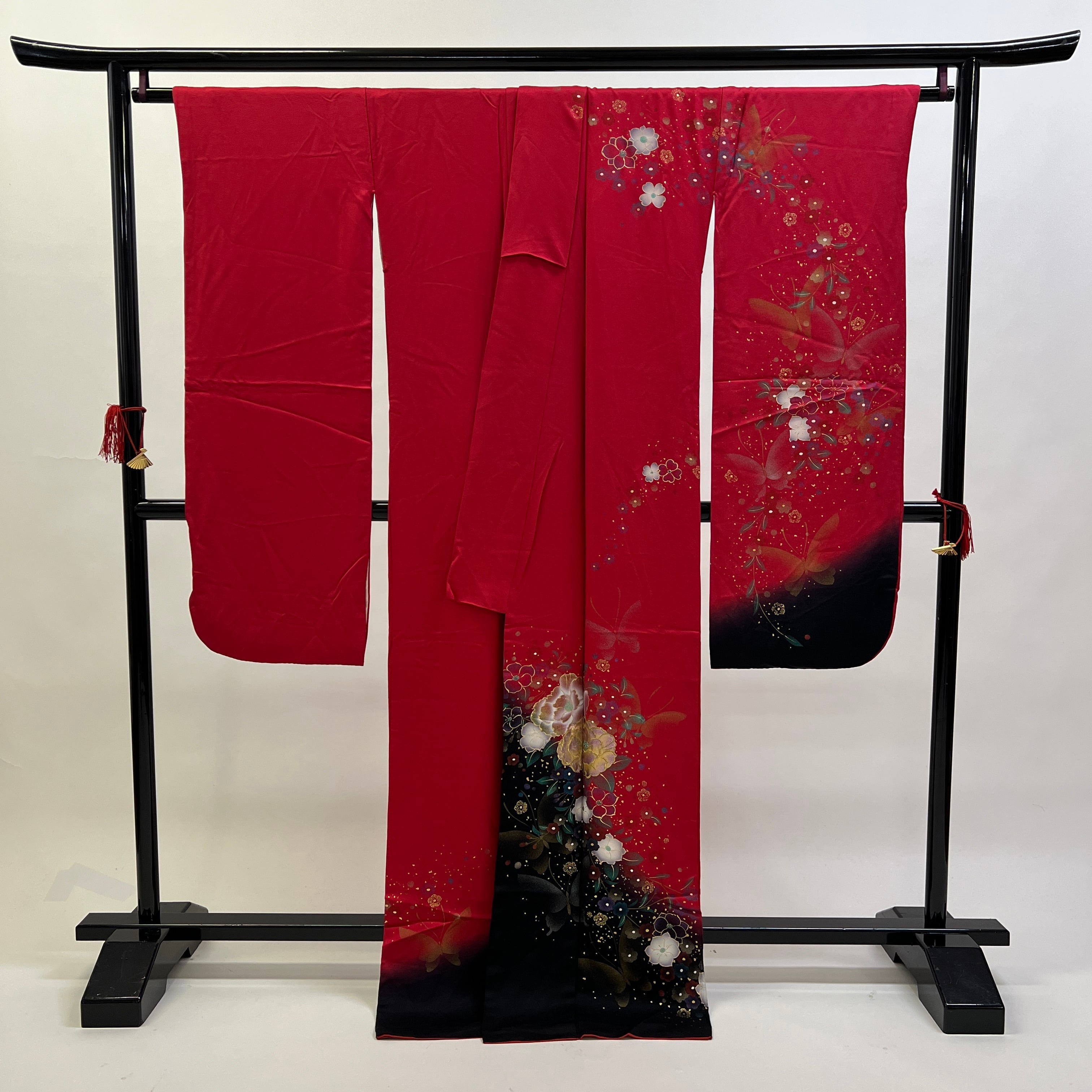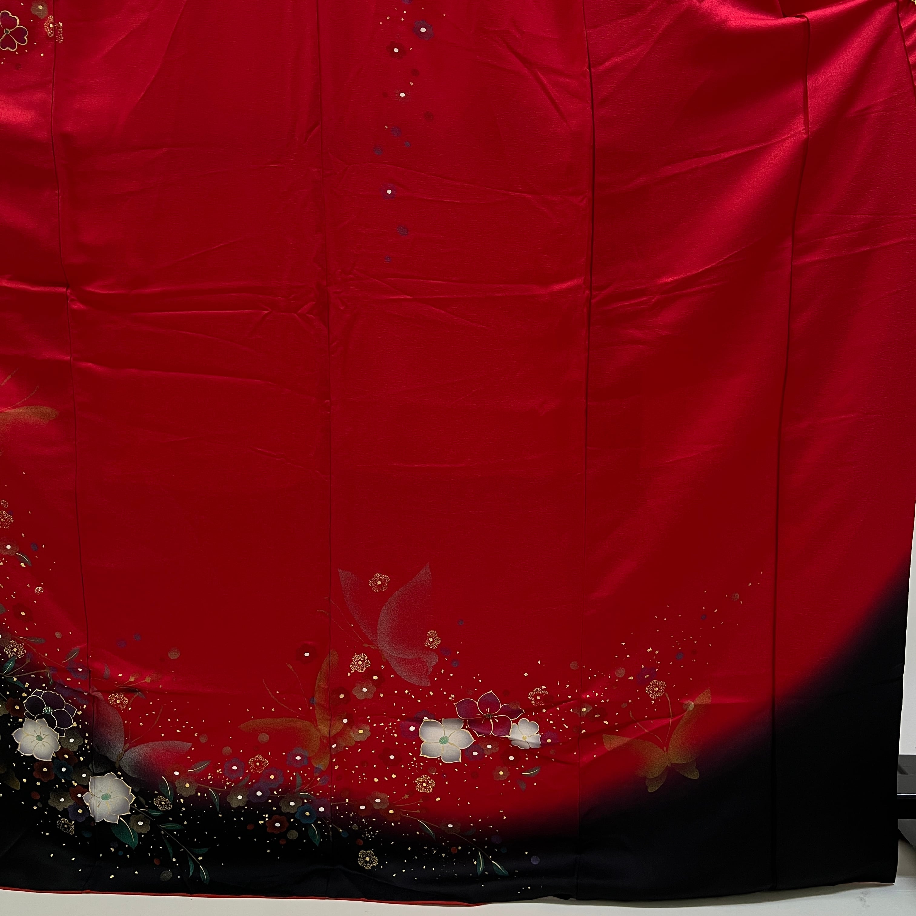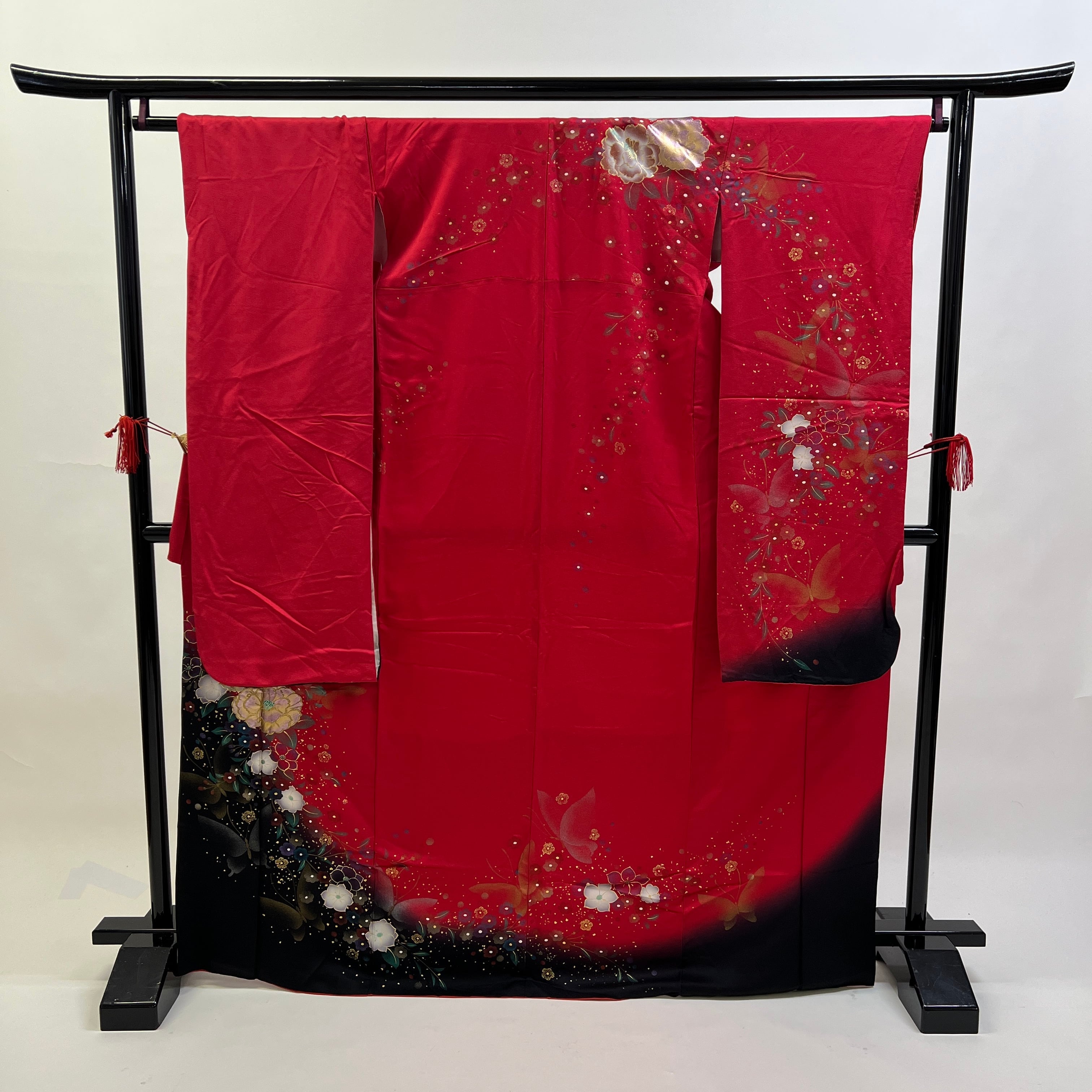 ・正絹 中振袖 振袖 赤地 蝶 牡丹 裾黒 3S610 HACX696