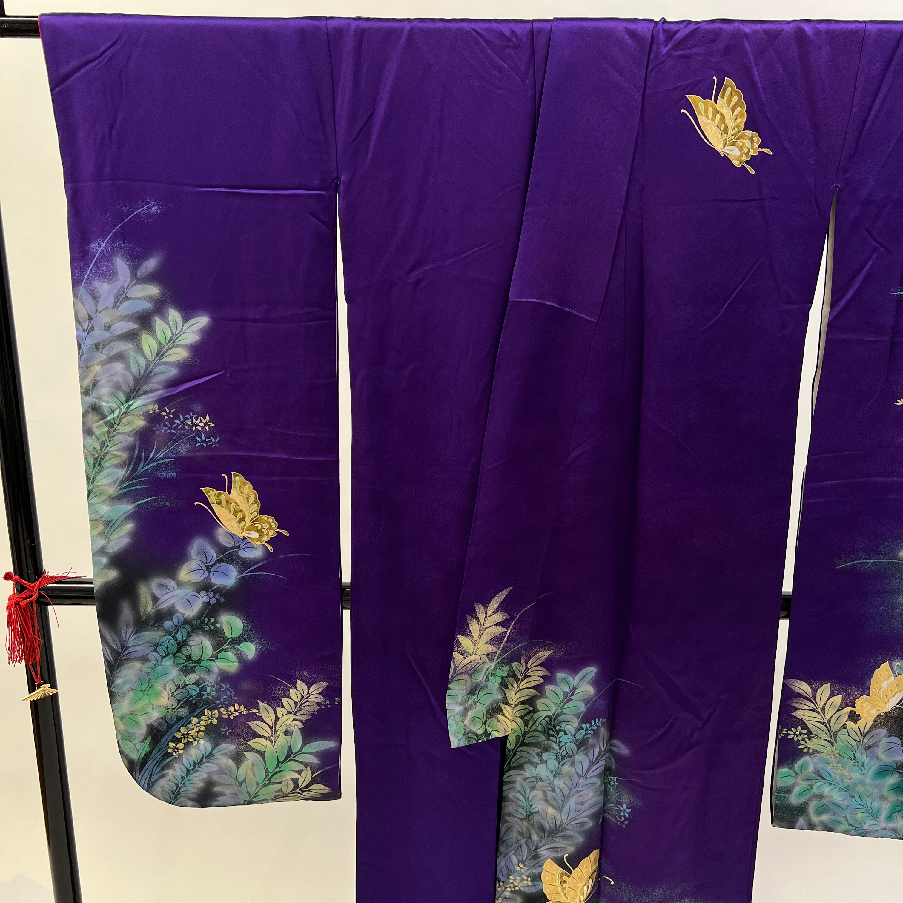 ・正絹 中振袖 振袖 紫地 金の蝶 ぼかし葉 3S395 HACY645