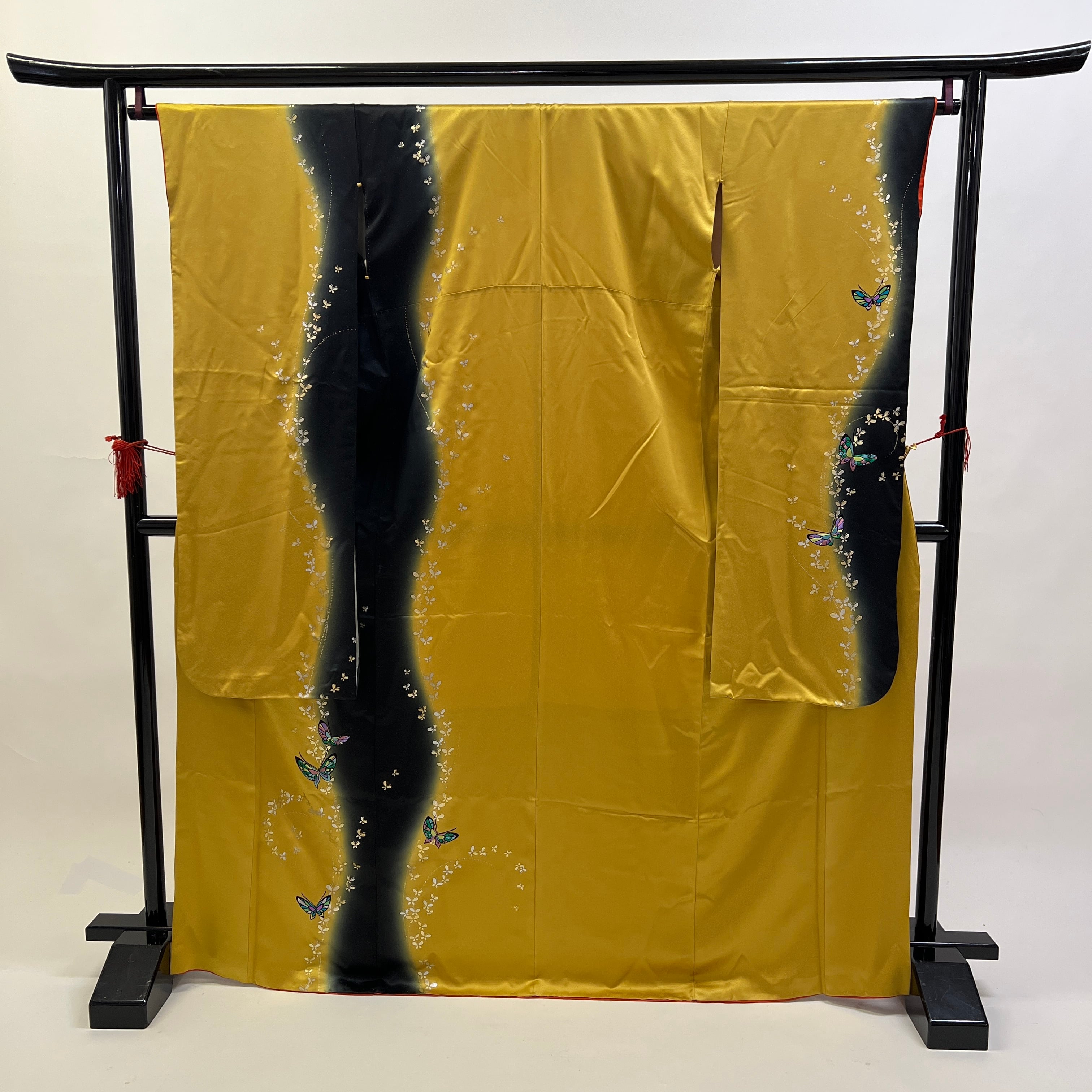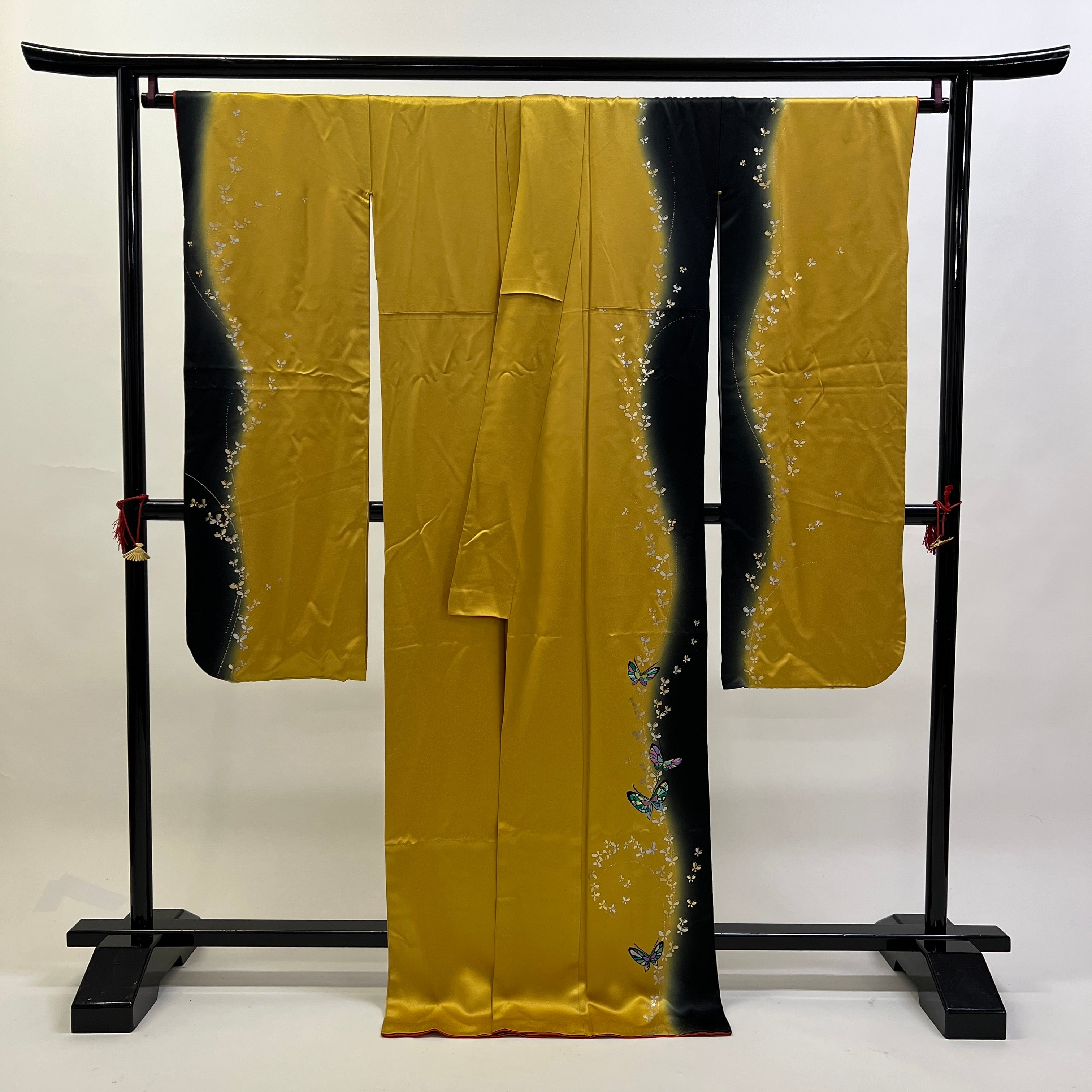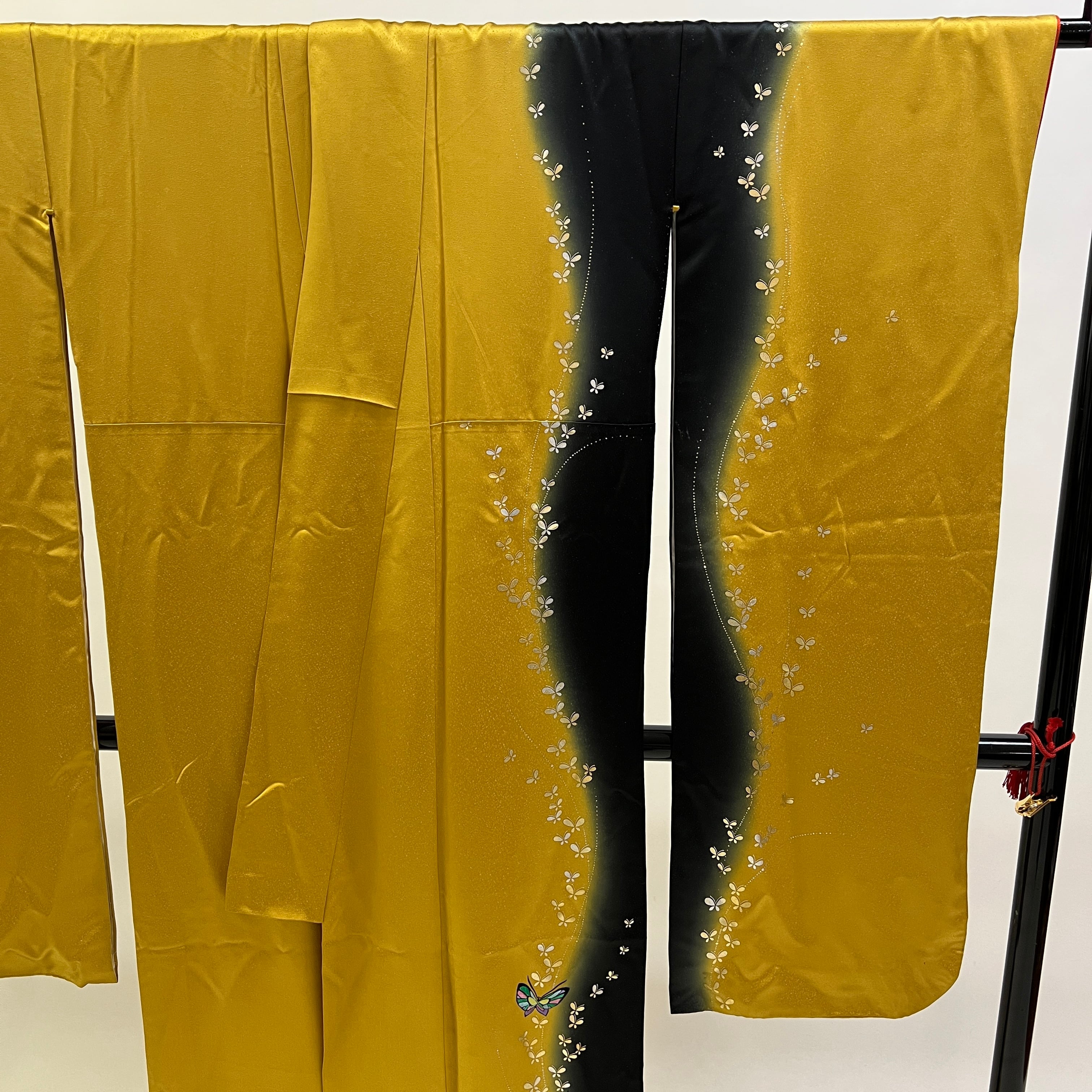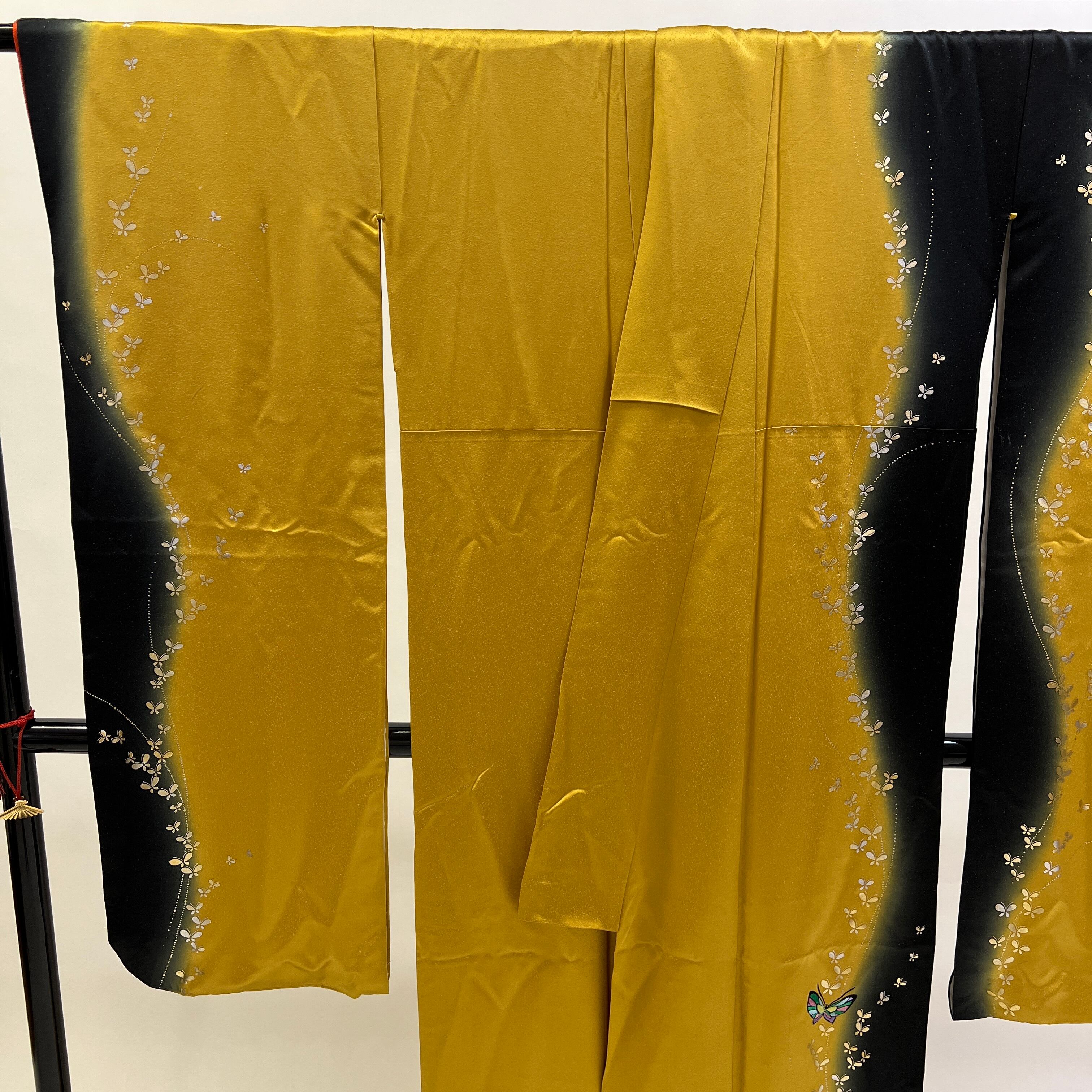 ・正絹 中振袖 振袖 からし地ラメ織 裾縦ぼかし 蝶 3S202 HZYA017