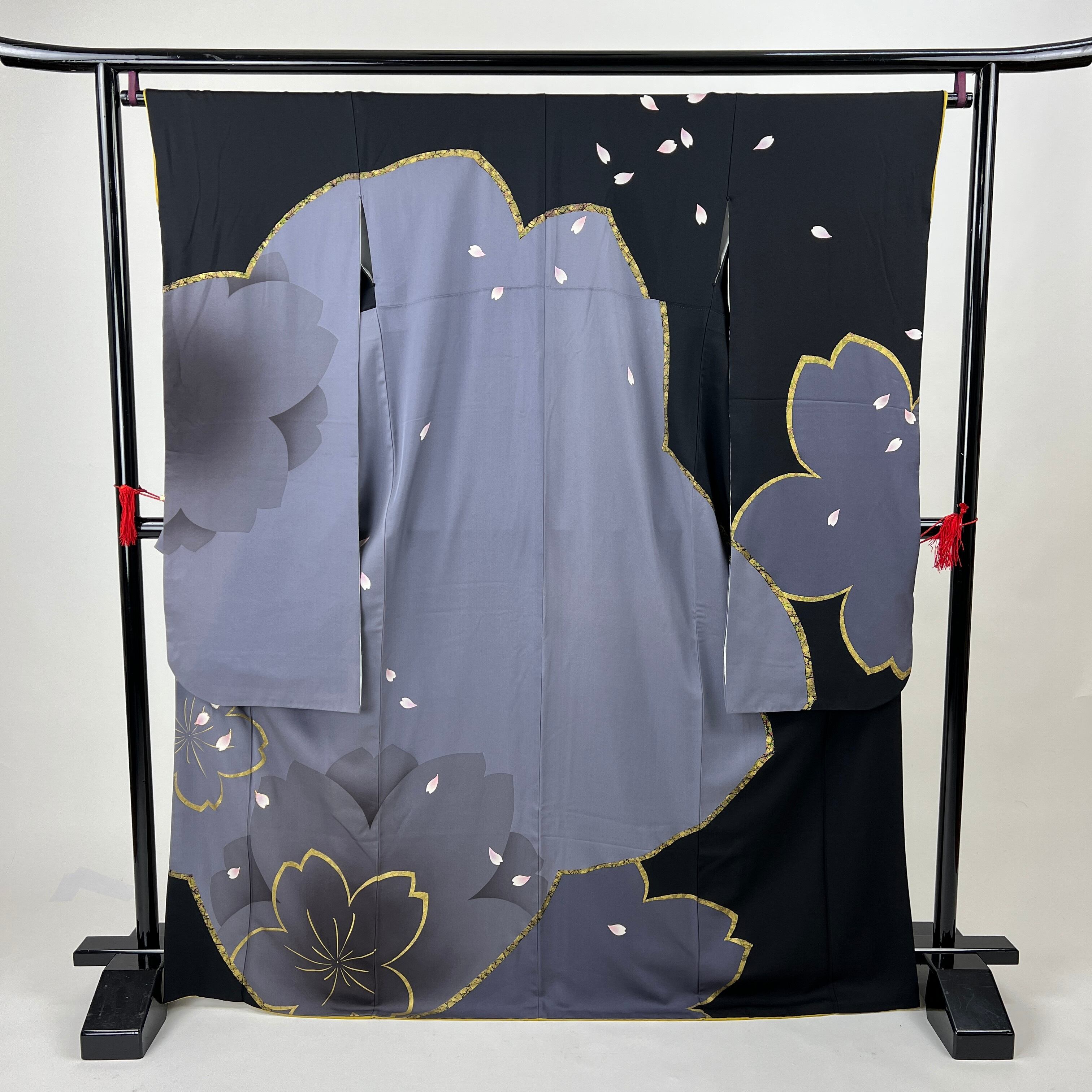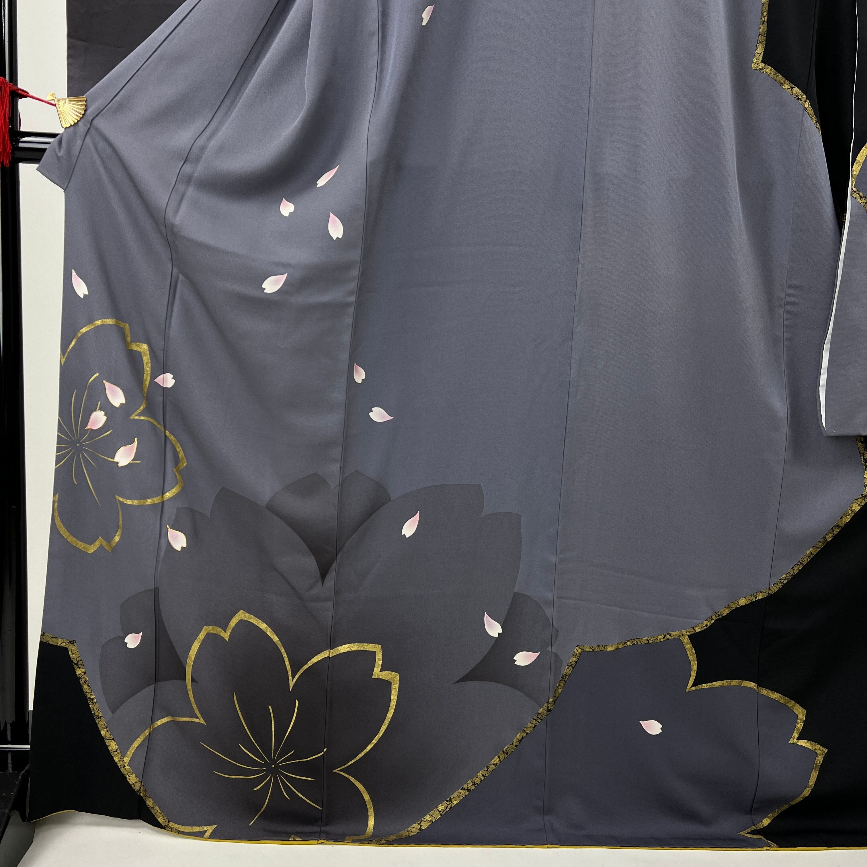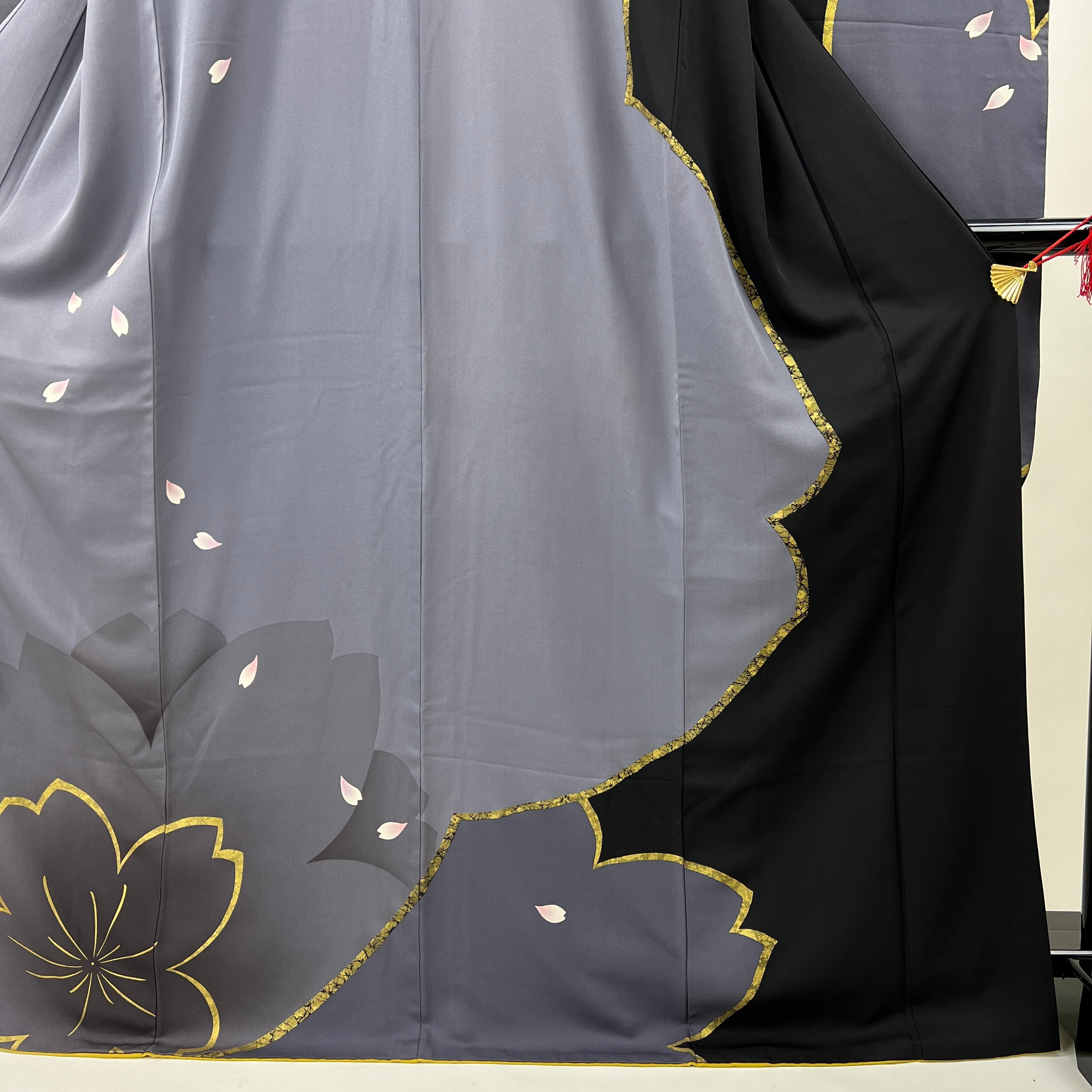 ・正絹 中振袖 振袖 黒グレー地 金線書 桜 4S388 HACX824000
