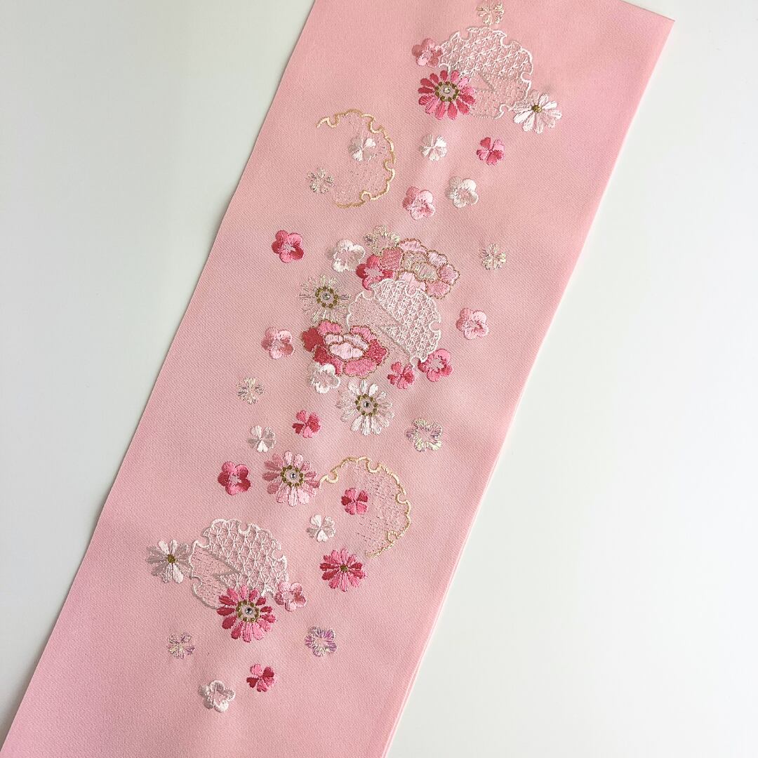 淡いピンクに、繊細なお花の刺繡がふんわり映える刺繡衿です。