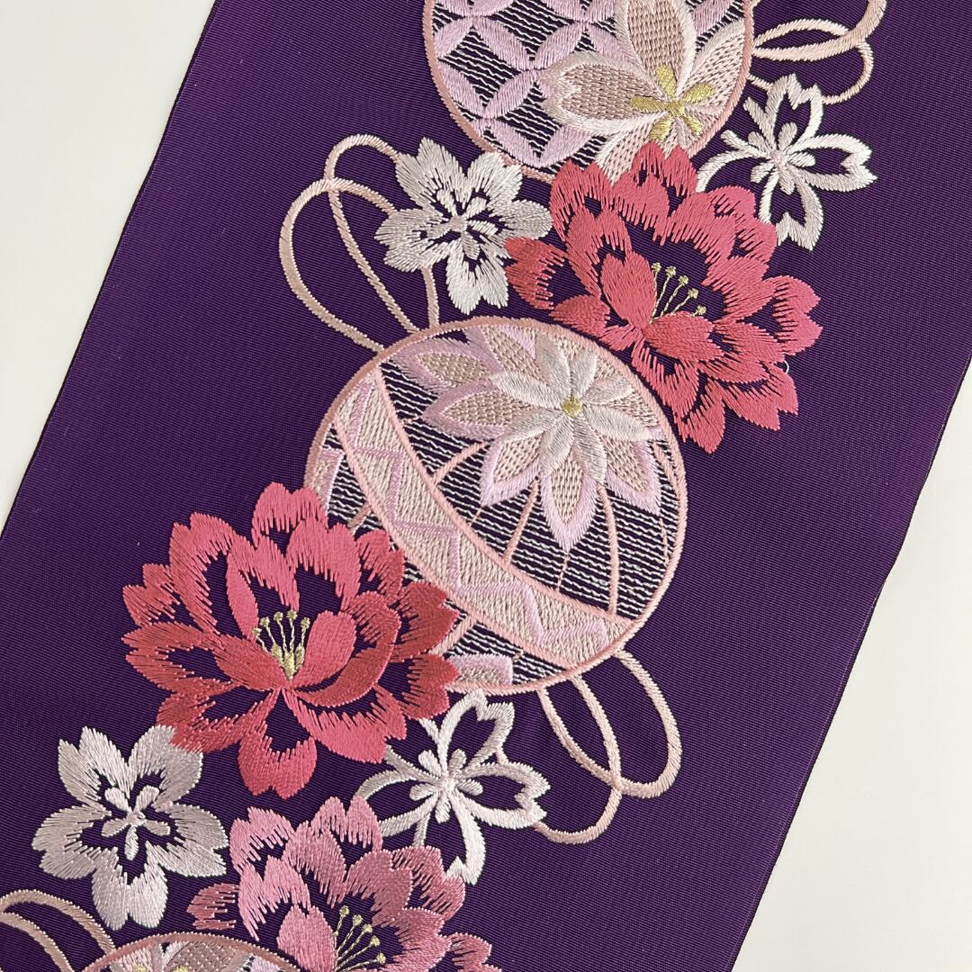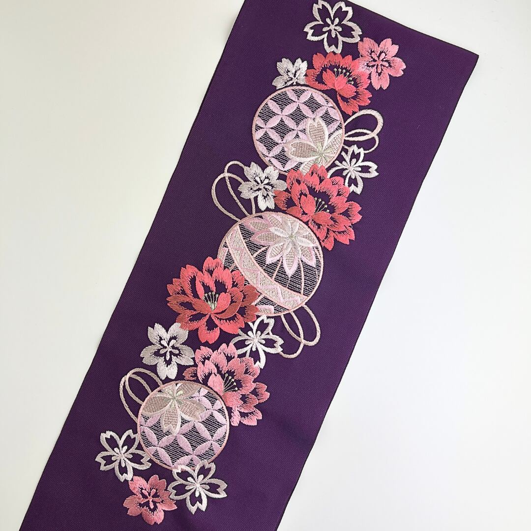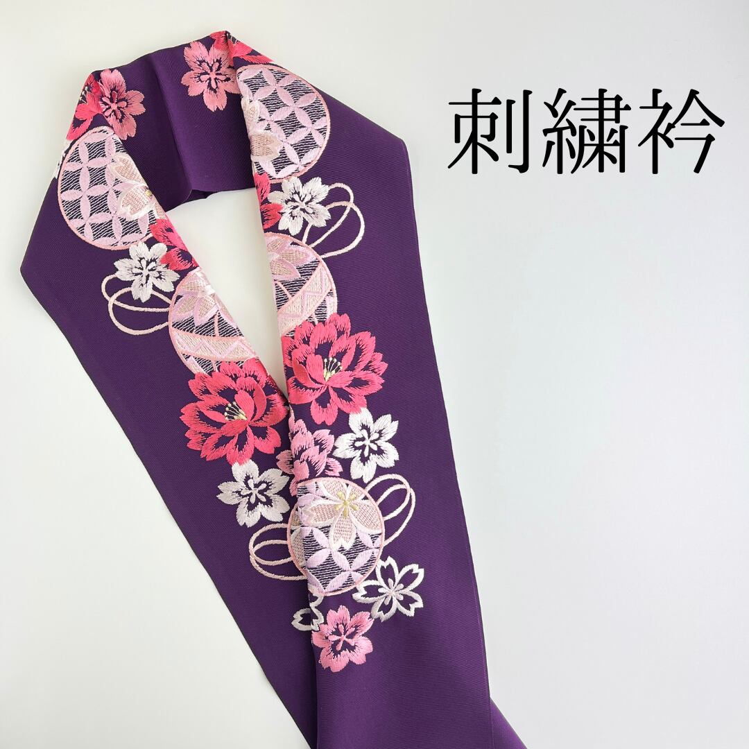 落ち着きのある紫地に、可憐なピンクの桜と鞠の刺繡がふんわり映える刺繡衿。