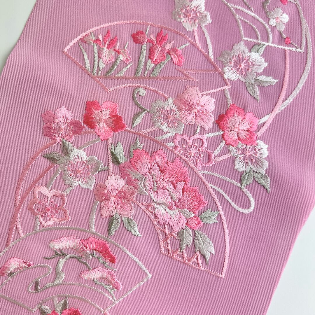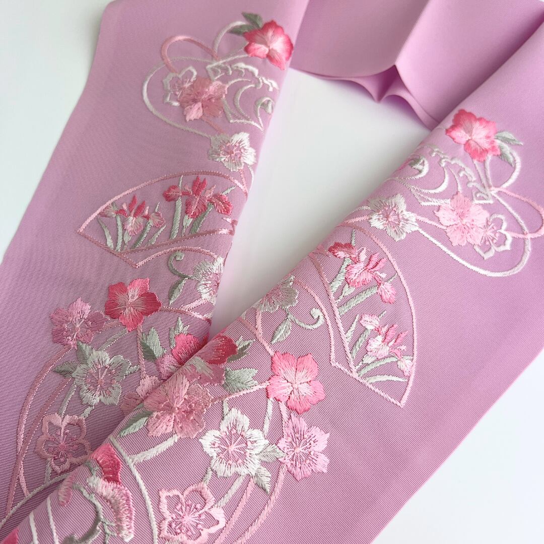 柔らかな薄紫地に、華やかな桜扇の刺繡が映える刺繡衿。