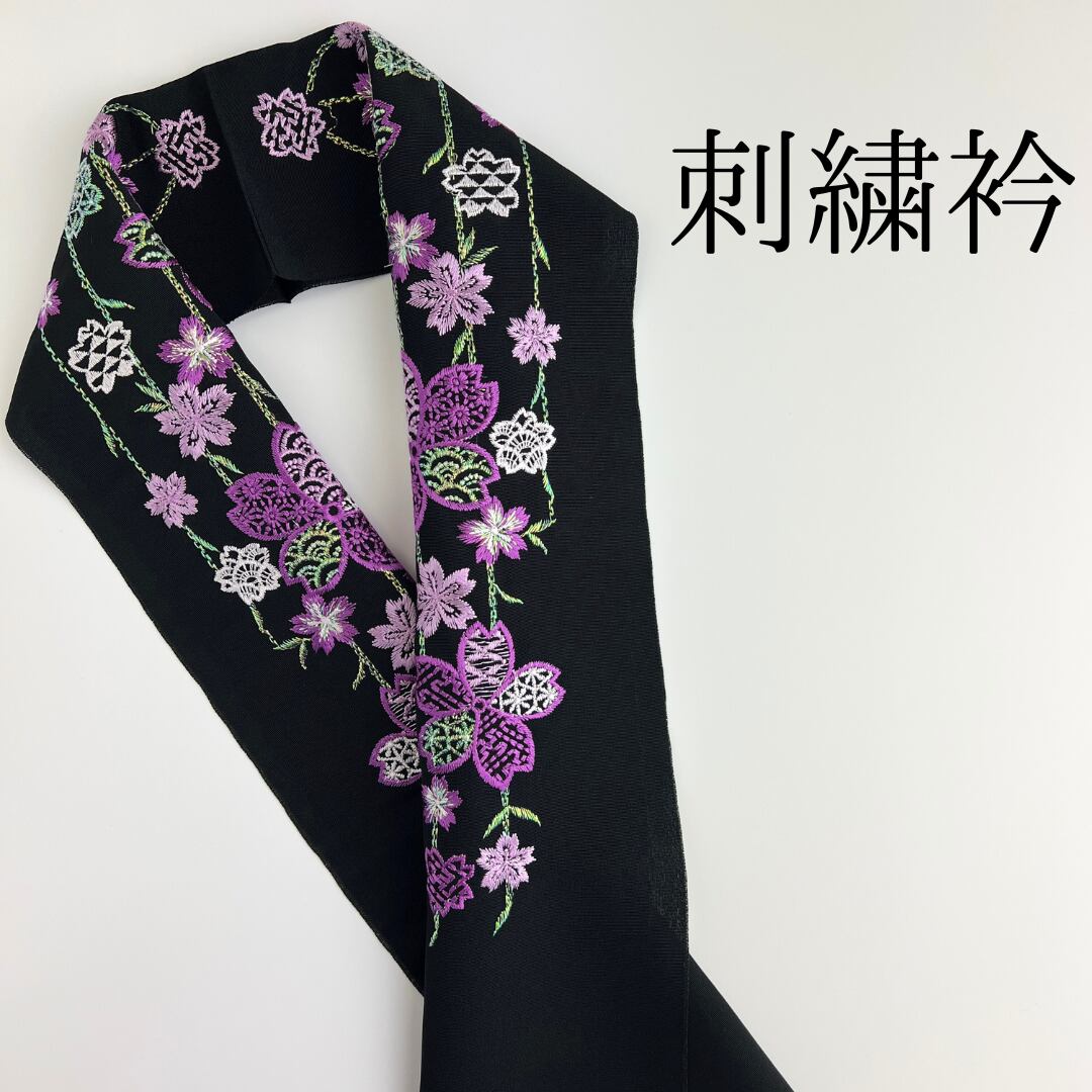シックな黒地に、上品な紫色の桜刺繡が映える刺繡衿。