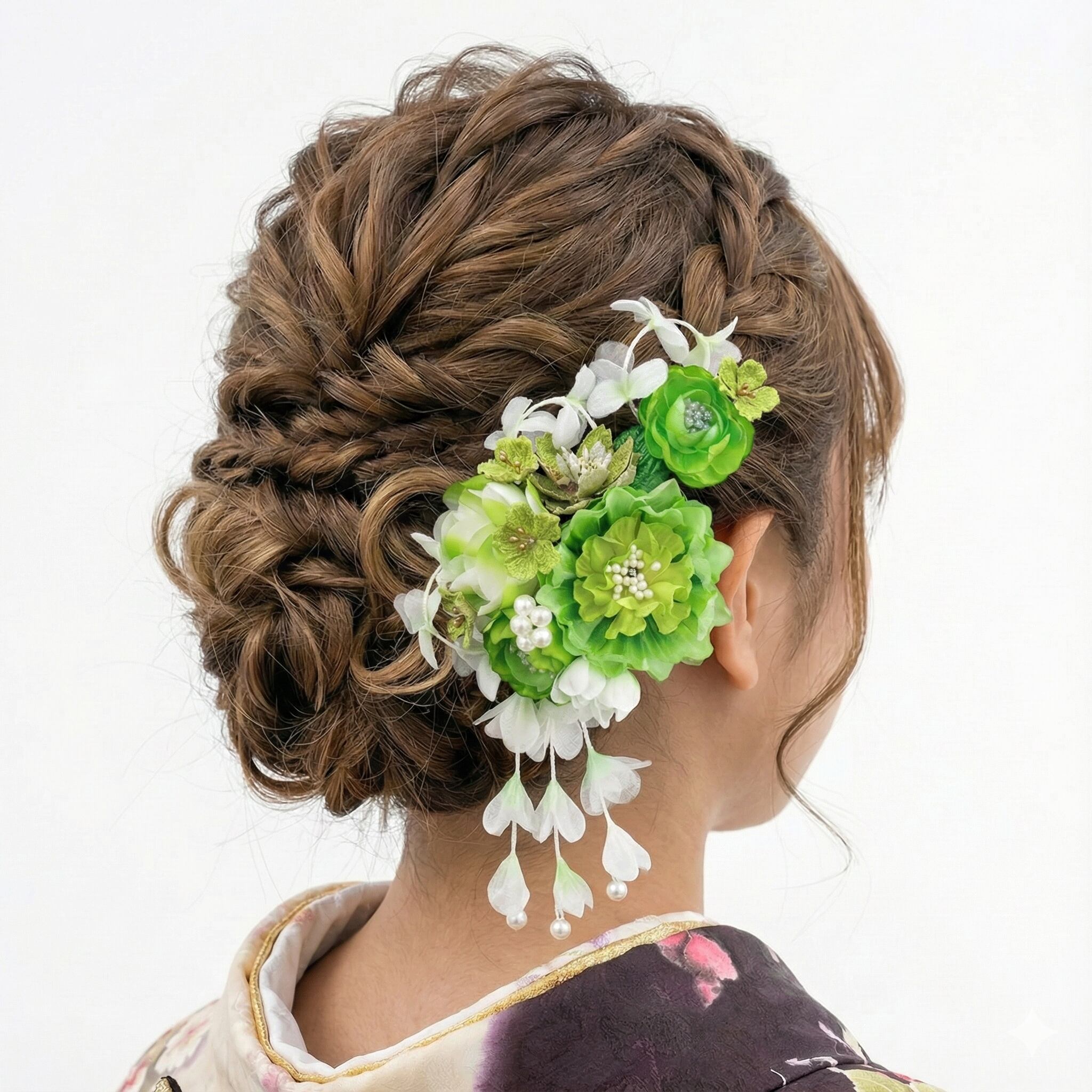 鮮やかな黄緑色の花が目を惹く可憐な髪飾りです。