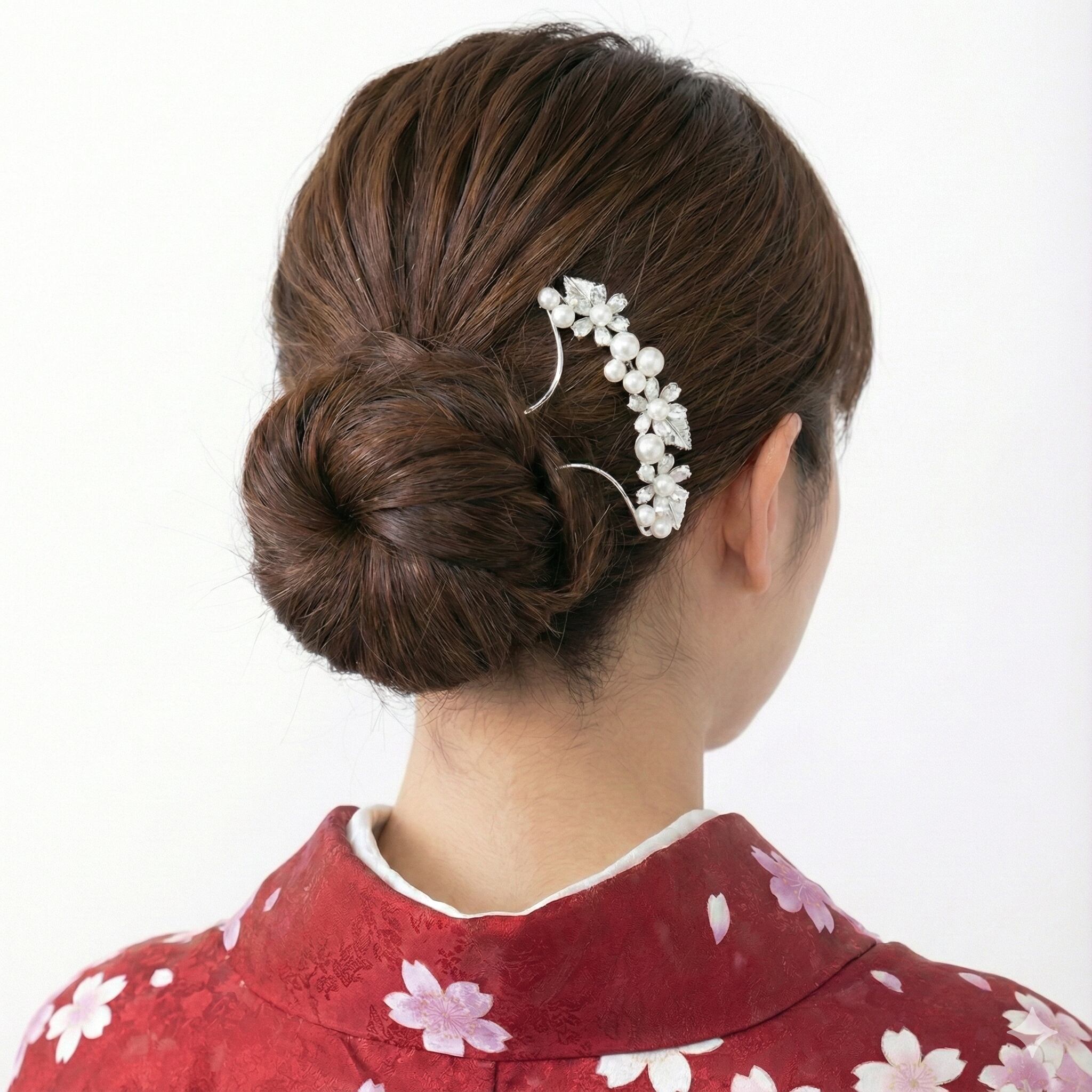 シャープなシルバートーンにパールを組み合わせた、上品でスタイリッシュな簪です。