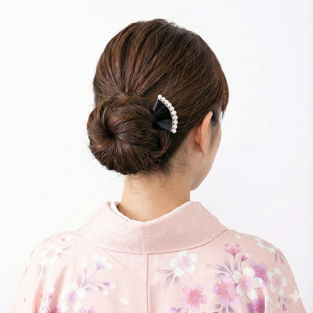 程よい光沢の黒台に、柔らかな光を放つパールを贅沢に並べた定番人気の簪。