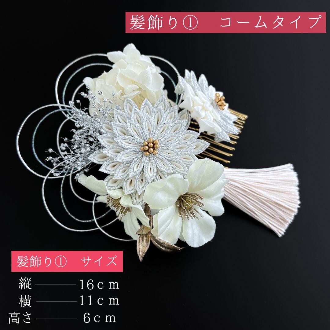 【白 花 髪飾り 4点セット】 成人式 卒業式 結婚式 振袖 袴 訪問着 着物 和装 浴衣 ゆかた シルバー 白色 つまみ細工 コーム式 Uピン式 花飾り 水引き飾り タッセル HCJA510