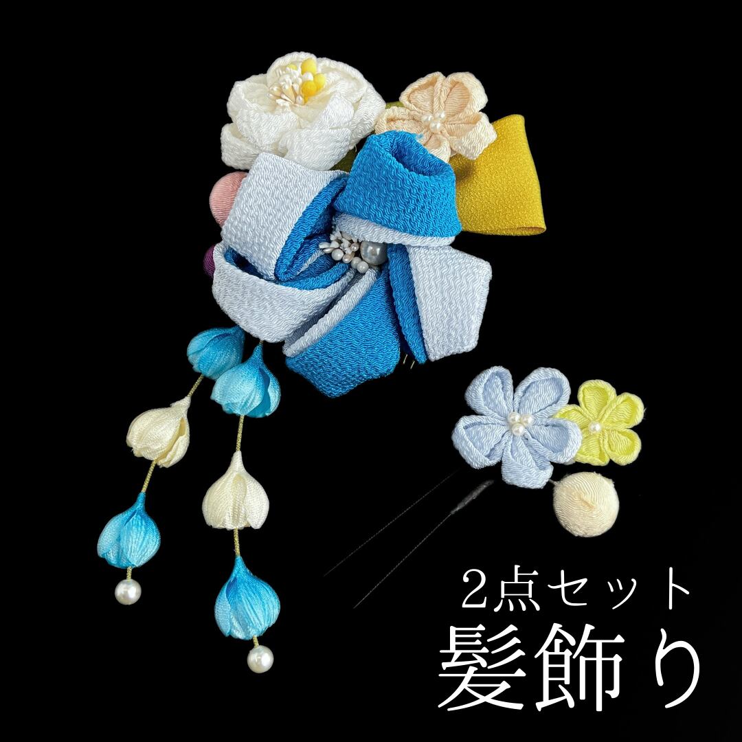 【水色 花 髪飾り 2点セット】 成人式 卒業式 結婚式 振袖 袴 訪問着 着物 和装 浴衣 ゆかた 青 花飾り コーム式 Uピン式 髪留め ちりめん生地 パール HCJA521