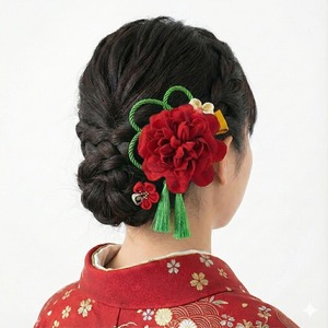鮮やかな赤の大輪花に、グリーンの組紐を合わせた印象的なデザイン。