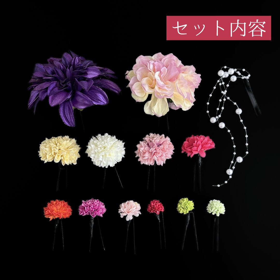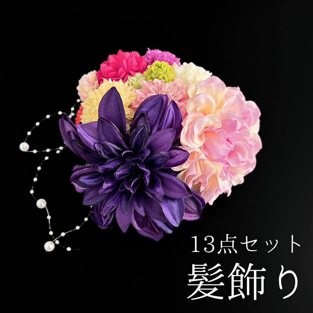 【紫 花 髪飾り 13点セット】 成人式 卒業式 結婚式 振袖 袴 訪問着 着物 和装 浴衣 ゆかた 紫色 ピンポンマム 菊 キク Uピン式 花飾り パール飾り HCJA431