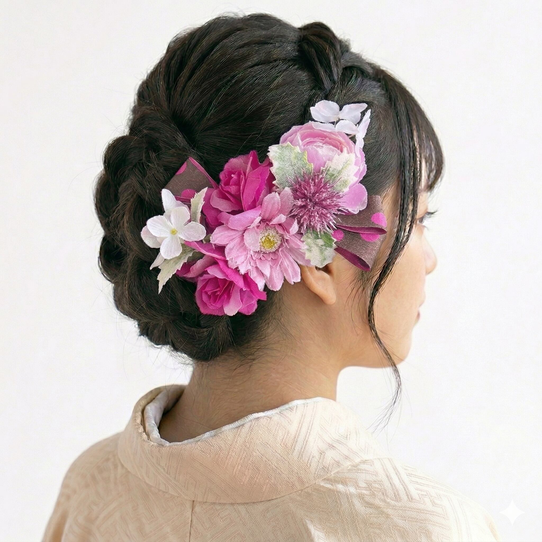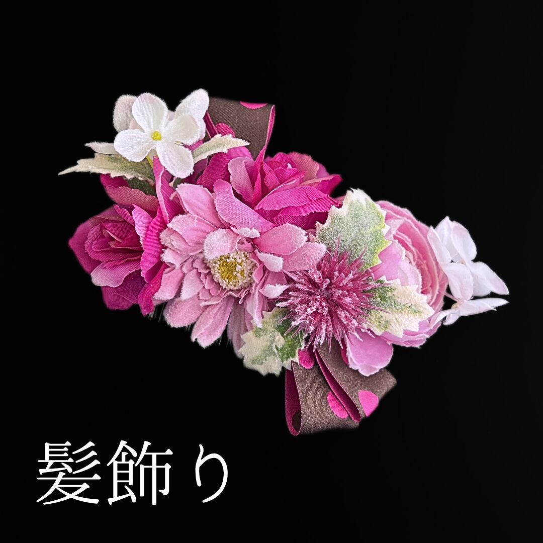 やわらかなピンクを基調に、小花とリボンを組み合わせた可愛らしさたっぷりの髪飾り。