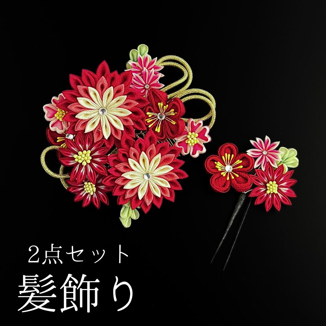 【赤 花 髪飾り 2点セット】 成人式 卒業式 結婚式 振袖 袴 訪問着 着物 和装 浴衣 ゆかた 赤色 花飾り コーム式 Uピン式 髪留め つまみ細工 ちりめん生地 ちりめん ビジュー 組紐 HCJA290